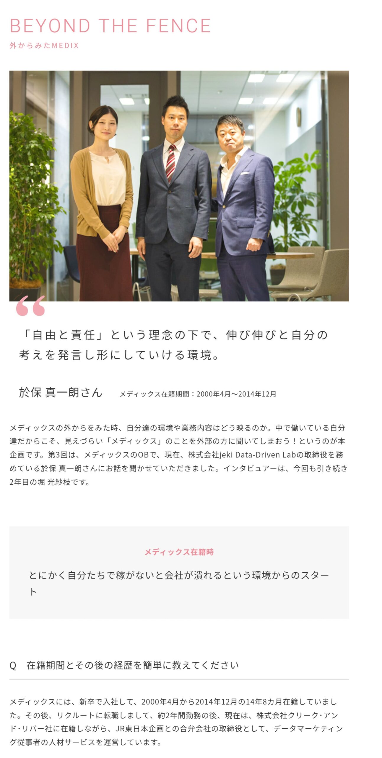 クライアント・パートナー・元メディックス従業員に、外から見たメディックスについてインタビューを実施しています。メディックスの、評価いただいていることや、期待していること、もっと頑張ってほしいことなどを、本音で語ってもらっています。