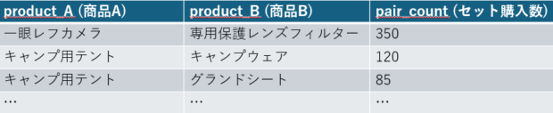 この結果をもとに、商品詳細ページで「よく一緒に購入されている商品」としてレコメンド表示を行ったり、セット商品としてパッケージ販売を行ったりすることで、客単価の向上を狙うことができます。