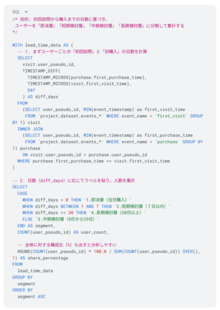 BigQueryであれば、ユーザーごとに「初回訪問の日時」と「購入の日時」の差分を正確に計算し、分布を可視化することができます。