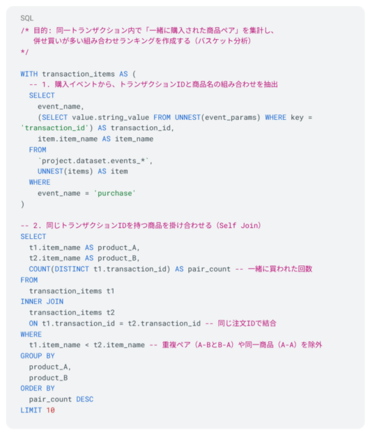 BigQueryを使えば、1回の決済(トランザクション)の中に含まれる商品データを解析し、「一緒に買われやすい商品の組み合わせ」を抽出できます。