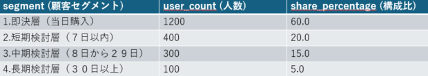 の4種類に分類して、ユーザーが購買に至るまでの期間の傾向を把握したい。