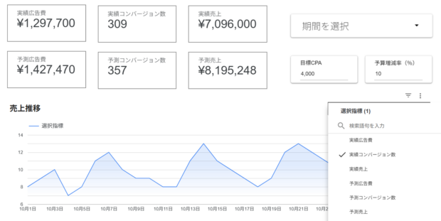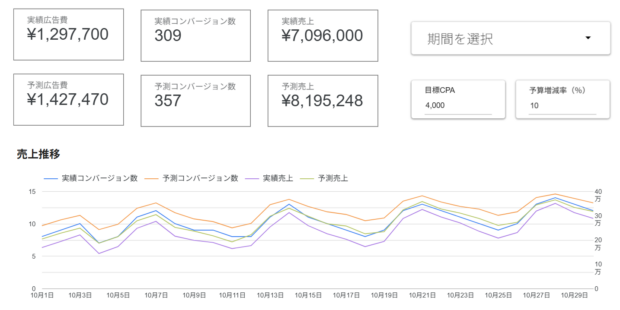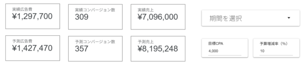 レポートでの見せ方: レポート上に「予算増減率(%)」と「目標CPA」の入力ボックス(またはスライダー)を設置。その下に、「予測コンバージョン数」と「予測売上」のスコアカードを配置します。