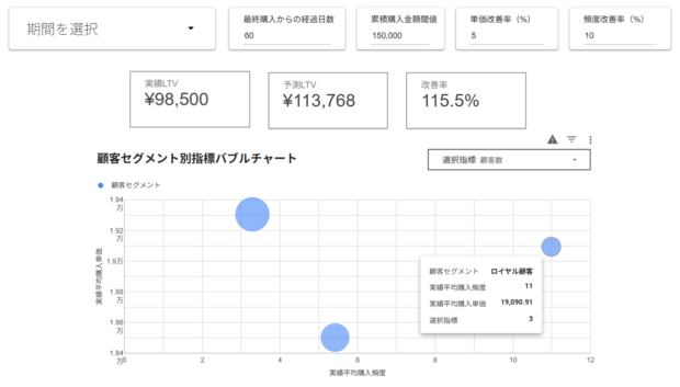 LTVは一般的に「平均顧客単価 × 平均購入頻度 × 平均継続期間」で計算されます。マーケターは、この各要素を改善する施策(単価アップ施策、リピート促進施策など)を打ちます。このダッシュボードでは、それらの施策が成功した場合のLTVへの影響を予測します。