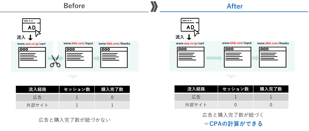 例えば、本体サイトのドメイン(例:www.aaa.co.jp)と、カートやフォームのドメイン(例:www.bbb.com)が異なる場合、クロスドメイン設定が必要です。