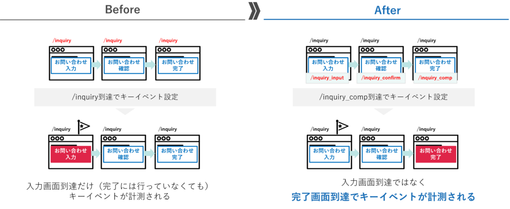 完了画面に到達したタイミングで「/inquiry_comp」といった仮想のURL情報をGA4に通知する仕組みです。これによって初めて、「入力画面到達」ではなく「完了画面到達」のみを正確に計測できるようになります。