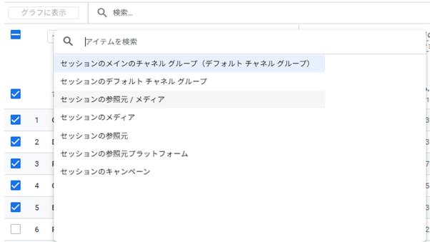 レポートの表の項目名にある 「セッションのデフォルト チャネル グループ」 と書かれたプルダウンをクリックし、「セッションの参照元 / メディア」を選択します。