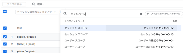 こうすることで、「utm_source(=参照元)」「utm_medium(=メディア)」に設定した値の組み合わせでデータをより詳しく見ることができます。さらに、プルダウンの右側にある「+」ボタンを押下し、セカンダリディメンションとして 「セッション キャンペーン」 を追加すれば、「utm_campaign(=キャンペーン)」ごとの成果も一目でわかります。