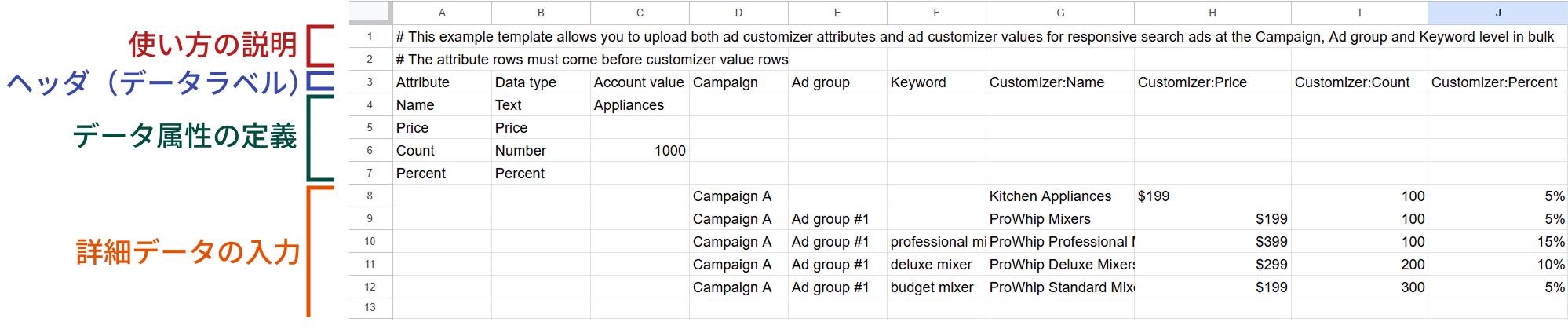 データフィードは一定の入力ルールに沿って作成する必要があります。テンプレートがGoogle広告の公式ヘルプにあるので、ダウンロードして使うことが可能です。