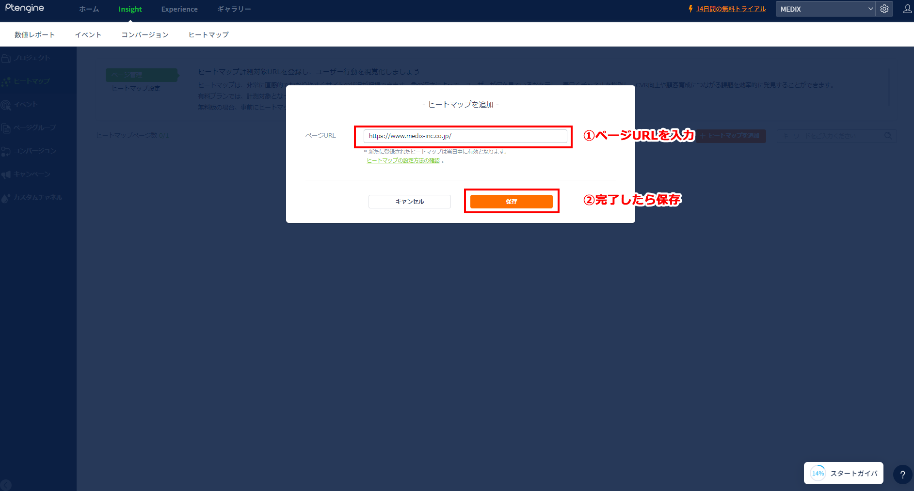 最後に、ユーザー行動を視覚化するために、ヒートマップ計測対象URLの登録を行います。