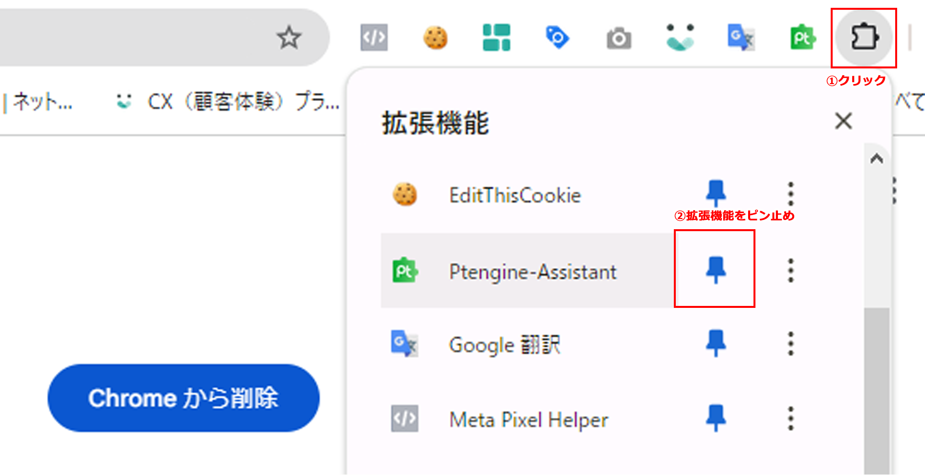 インストールが完了したら、画面右上から拡張機能のアイコンをクリックしてPtengineの拡張機能をブラウザに固定すると次回からの起動に便利です。