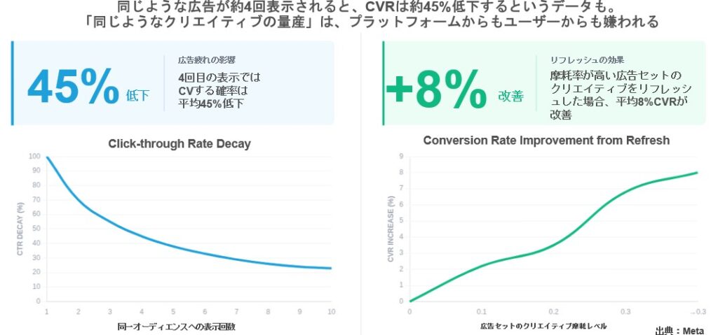 実際に、同じような広告が約4回表示されると、コンバージョン率(CVR)が約45%低下する、というデータもあり、同じようなクリエイティブの量産はMetaのアルゴリズムからも、ユーザからも嫌われてしまうことが分かっています。