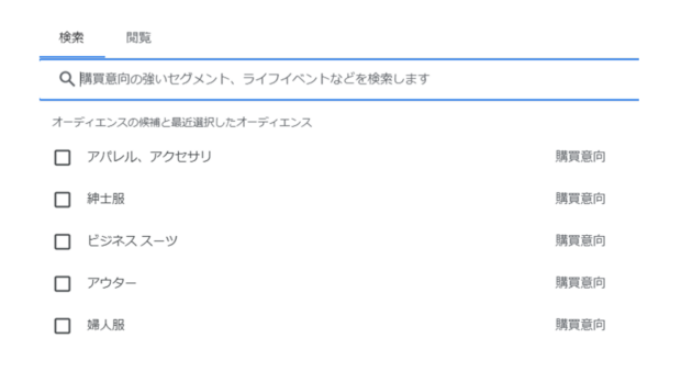 その名のとおり、購入意向が強いと判断されたユーザがセグメントされたオーディエンスで、ユーザの検索行動や、サイトの閲覧行動などをもとに判断されています。スポーツウェア、販売系の求人情報、投資サービスなどを選択できます。