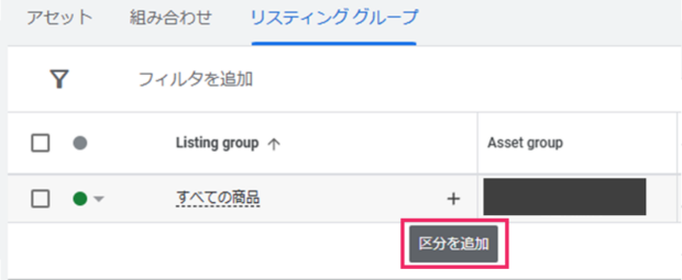2. リスティンググループの隣に表示される区分を追加をクリック