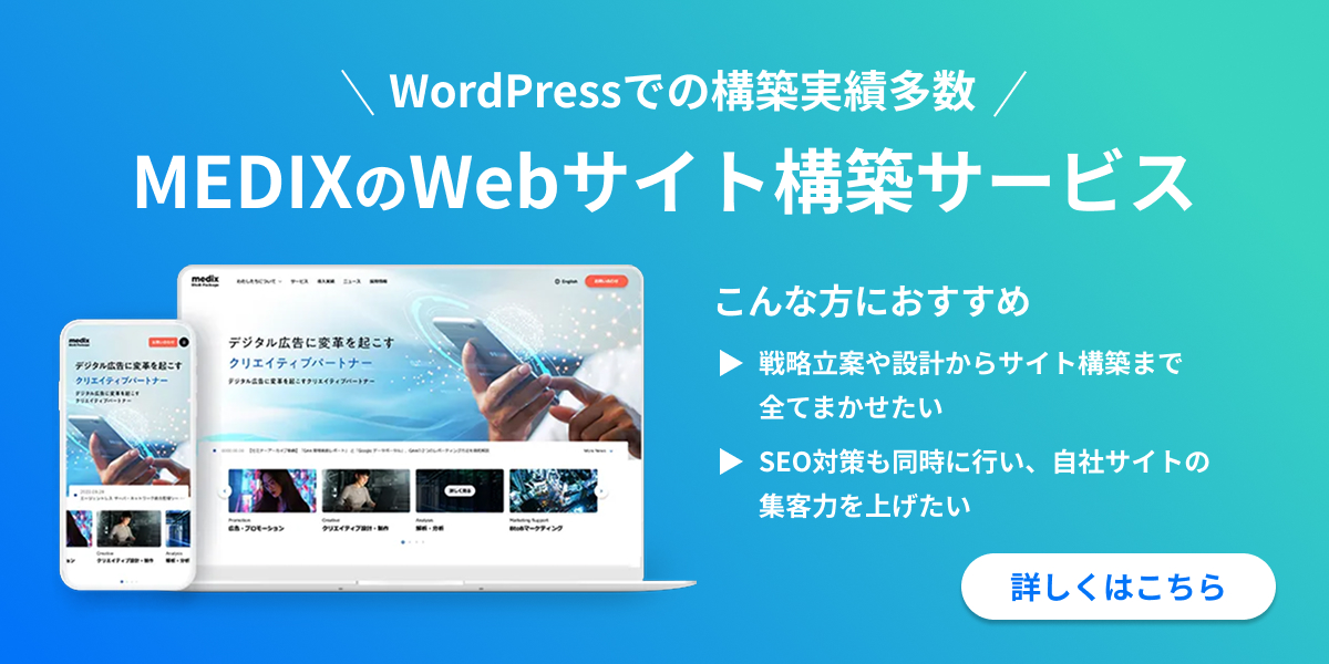 株式会社メディックスでは、WordPressを利用したWebサイト構築を手掛けており、豊富な実績がございます。単なる制作にとどまらず、お客様のビジネスゴールに向けた企画立案から、SEOを意識した構築、そして公開後の運用保守やアクセス解析による改善提案まで、ワンストップで対応可能です。「WordPressで成果の出るサイトを作りたい」「今のサイトをリニューアルしたい」とお考えの方は、ぜひお気軽にお問い合わせください。